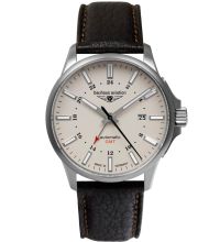 from the model series Aviation Automatic Titanium 42mm 10ATM. The GMT function for displaying a second time zone is easy to read using the arrow-shaped and color-highlighted second hour hand. This means you can always keep an eye on your home time and local time. A perfect choice if you are looking for a timepiece with