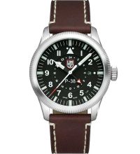 from the model series P-38 Air Pilot GMT 42mm 100M. The GMT function for displaying a second time zone is easy to read using the arrow-shaped and color-highlighted second hour hand. This means you can always keep an eye on your home time and local time. A perfect choice if you are looking for a timepiece with