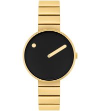 Picto® challenges the idea of a classic watch with two hands and a dial with numbers. Here, the hour is indicated by a dot on the rotating dial, while the minutes are indicated by a conventional hand. |  |