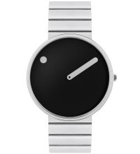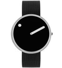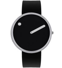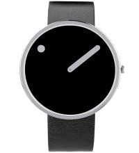 Picto® challenges the idea of a classic watch with two hands and a dial with numbers. Here, the hour is indicated by a dot on the rotating dial, while the minutes are indicated by a conventional hand. |  |