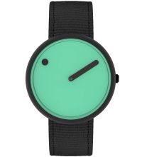 Picto® challenges the idea of a classic watch with two hands and a dial with numbers. Here, the hour is indicated by a dot on the rotating dial, while the minutes are indicated by a conventional hand. |  |
