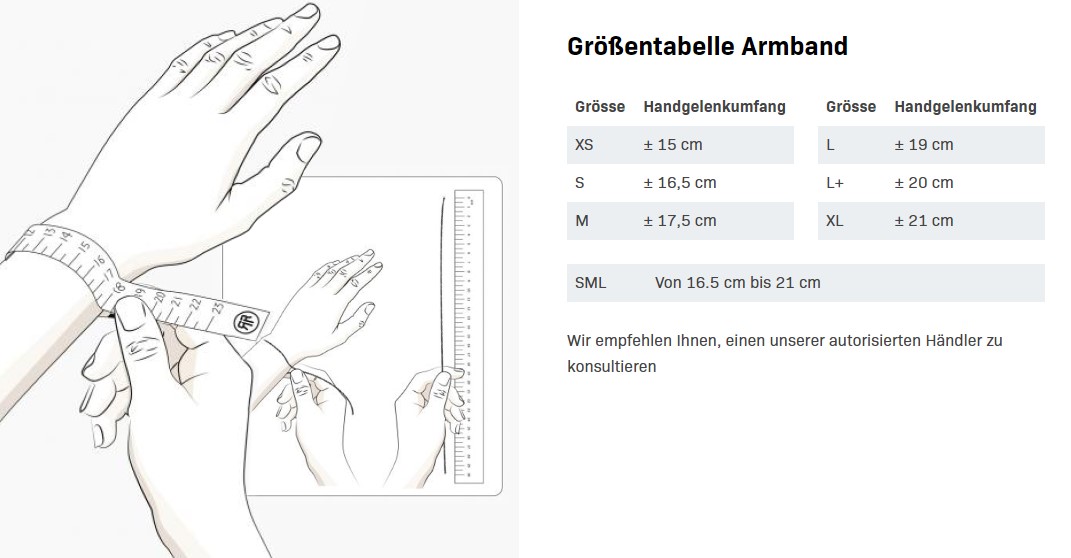 You can find out the size of a bracelet by the last value in the article number: RR-40116-S-S. In this example, the value marked in red stands for a length of ± 16,5 cm.